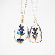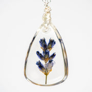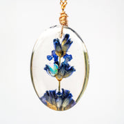 Summer, known for her exquisite craftsmanship, encapsulated the delicate purple buds of our lavender plants in elegant clear resin, combined them with stunning gems, and created one-of-a-kind artisanal jewelry pieces, complete with two distinct 18" chain options.